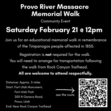 Hi everyone! The third annual Fort Utah Massacre Walk in Provo, Utah, was a great success. It was a beautiful sunny day when some 50 people turned out in remembrance of the tragic Fort Utah Massacre that occurred in 1850 between the Timpanogos Nation and the Mormon militia.